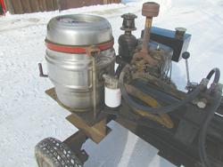 The 17 hp Wisconsin 2-cycle engine that starts with a hand crank came off an old baler. He made the front wedge out of an old locomotive shaft and purchased the 8-in. steel beam, car axle and tires ("donut" tires) from a local junkyard. Ingerson purchased a two-stage pump, and his son built the fuel tank.