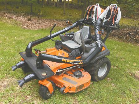 Bob O'Neil clears his local school's mile long cross-country running trail with what he calls his “Blowdozer”, a Husqvarna zero-turn mower equipped with a pair of Stihl backpack leaf blowers.