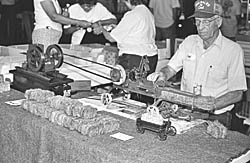 Carl Veldhuizen, Plymouth, Minn., makes small bales using a mini stationary baler that's powered by a model "hit and miss" gas engine that he put together from a kit. The baler is scaled after a 1930 wire hand-tie, stationary model.