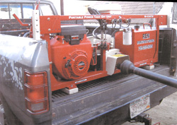 It has its own engine so no modification of the pickup is required. It mounts on vibration-free rubber skids and simply anchors itself in the pickup's stake pockets. A throttle controls engine speed which in turn controls pto speed, and a lever puts the pto in and out of gear.
