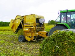 He cut and windrowed soybeans with a MacDon windrower. When the moisture content had dropped to 60 to 70 percent, he baled the crop in large round bales and wrapped them in airtight plastic.