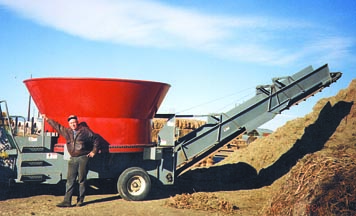 Bob Anderson and his brother Joe started Haybuster Co. in 1966 when they introduced the market's first pto-driven tub grinder. Bob later went on to work for Farmhand Co., demonstrating and selling tub grinders to dealers, feedlots, and dairies. "I always seemed to leave a tub grinder demonstration telling myself that there must be a better way. So after 25 years of experience with tub grinders I decided that I could build a better one," says Anderson. His patented new "Tophand" tub grinder breaks the stems without turning the leaves into dust. The pto-driven machine has no screens and works much like the cylinder and concave inside a combine. It also has a heavier-than-normal hammer that runs only 50 to 60 percent as fast as hammers on conventional tub grinders. An auger located next to the hammer mill pushes chopped material onto a belt-type discharge conveyor at the back of the machine. "The cylinder and concave action, combined with the low hammer speed, allows it to break the stems without beating the leaves into dust. It makes a coarse-ground, more digestible feed that results in better animal health," says Anderson. "It cuts hay stems at least 1 1/2 to 2 in. longer than conventional tub grinders do. If the hay is put up in prime condition with low moisture leaves, the leaves will be left whole and hanging onto the stems when they come out of the machine. In dry hay it has about the same capacity as a conventional tub grinder. However, because of the design in wet, tough hay it has much higher capacity. I've used it to grind 30 percent moisture, first-cut alfalfa that would plug up most traditional tub hay grinders right away. I think it could even be used to process silage bales, although I haven't tried it on them yet. "The problem with conventional tub grinders is that they try to pound wet forage through a screen, which gets plugged up. The hammers keep beating the material around and around so that it acts like a brake on the hammer mill and causes it to get hot. It can even tear out the tractor pto. Another advantage is that the machine requires less power to operate. The 1,000 rpm pto direct-drives the hammer without the need for a gearbox to increase the hammer speed. That results in less vibration and fewer mechanical problems. The machine has only about half as many parts as a conventional tub grinder. I've used it to grind hay for local dairy-men for more than one year. They all say they like it," says Anderson, who expects that the machine, if manufactured, would be comparable in price to a conventional tub grinder. He's looking for a manufacturer.