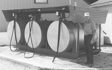 Lorne and Vic Bossuyt, Oak Bluff, Manitoba, mounted three 500-gal. fuel storage tanks -- one diesel and two gas -- on a steel skid so that the tanks can be quickly relocated in case there was ever a fire in one of their nearby buildings. "We can just hook a chain to the skid and tow it away with a tractor," says Lorne. Each tank is equipped with an electric pump and hose. The pumps are turned on and off from a control panel in a nearby building. Underground wires connect the pumps to the control panel. "We always keep the power off except when fuel is being pumped into a tractor or vehicle. The wires are light enough that they'll break easily if we don't have time to cut them, and because the power would be off there wouldn't be any sparks," says Lorne. They used an old semi truck frame to build the 15-ft. long, 5-ft. wide skid. The truck frame wasn't wide enough to accommodate the 7-ft. 2-in. long fuel tanks so they cut the cross members to weld in new material to widen the frame by 1 1/2 ft. The tanks ex-tend about 1 ft. beyond each side of the skid. They welded a hook onto each end of the frame. They also rounded off the ends of the frame so that the skid can be dragged in either direction. The tanks ride in saddles made from flat metal and are covered by a metal roof that reduces evaporation caused by sunlight. They used 3-in. channel iron to make the roof frame and made the roof itself by bolting together big sheets of metal designed for culverts. Both ends of the roof were bent down and bolted to vertical steel pipes. The skid rests on concrete pads designed for outdoor patios. The concrete pads keep the skid from sinking into the ground. There's enough room to walk between the tanks for maintenance or repainting. "We've never had to move it, and we hope we never do," says Lorne. "The tanks are filled from the back or the rear. We had been using overhead tanks, which were difficult to fill. We also used three underground tanks but had problems with water leaking into the tanks, which caused damage to the fuel pump on our diesel tractor. We plan to build an-other skid with two tanks just for diesel fuel."