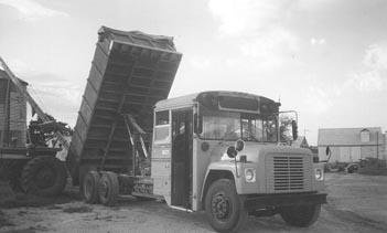 "It works as well as any conventional heavy duty grain truck but cost a lot less," says Armin Scripter, Abilene, Kan., who turned an old 65-passenger school bus into a 350-bu. grain truck. Scripter started with a 1977 International 1700 school bus equipped with a 392 cu. in. engine and automatic transmission. He removed everything except for the front portion of the bus and the frame. He unbolted the rear 10-in. section of the bus body, moved it forward, and rebolted it just be-hind the first row of seats to form a cab. He mounted a 17-ft. truck bed and hoist on the open frame behind the cab. He then mounted a pusher axle -- made from the front axle from another bus -- in front of the rear wheels. The bus's power steering pump is used to operate the dump hoist. "It gets a lot of attention and didn't cost much to build," says Scripter. "The bus's yellow color makes a nice contrast with the red truck bed. I bought four buses and originally planned to use them for storage. I made the conversion when I needed another truck. We use it to haul grain from the field to our bins and from the bins to town. By mounting homemade steel sideboards off another truck I can haul up to 400 bu. with it. The extra pusher axle helps distribute the weight and reduces compaction in the field. "The bus was already equipped with air brakes, power steering, and an automatic transmission. I mounted a Brownie 3-speed transmission behind the automatic transmission which gives it a lot of pulling power. It has twelve forward gears and three reverse."