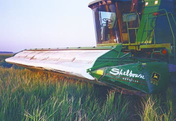 "I wanted a bigger stripper header but I didn't want to spend the the money a commercially-built stripper would cost," says Norman Madden, Newport, Ark. He put together his own "stripper" header by mounting a Shelbourne Reynolds stripper rotor on a Deere grain header. Stripper headers pull grain heads off standing stalks of grain, leaving the stalks standing and feeding only grain and chaff through the combine. They were developed in England and are now being marketed in North America by Massey Ferguson. The idea has caught on in certain areas of the country, particularly the Northwest, where wheat yields tend to be the heaviest, and down South. Madden bought the shell of a 25-ft. Deere 925 grain header at a salvage yard, equipped with a pipe reel and table auger but no cutterbar. He also bought a burned, 20-ft. wide Shelbourne Reynolds stripper header. The stripping rotor in the header consisted of two 10-ft. long sections supported by a center bearing. He cut a 5-ft. length out of another stripper rotor and bolted it in between the two 10-ft. rotor sections, and then mounted the rotor on the header. He mounted the Shelbourne domed housing on the Deere header over the rotor, just like on the original stripper header. He had to lengthen the 20-ft. housing out to 25 ft. The rotor mounts just ahead of the Deere header's 10-in. dia. reel pipe, which delivers stripped material into the Deere header's table auger. The rotor is belt-driven off the combine's feeder house drive. The reel pipe is driven by the hydraulic motor that originally drove the Deere header's reel. The table auger is chain-driven off the original right feeder housing drive on the Deere combine. "I used it last year to harvest 600 acres of rice and it was almost trouble-free," says Madden. "I had been using a 20-ft. Shelbourne Reynolds stripper but wanted more capacity. However, the company's biggest rice model is only 22 ft. wide. The extra 5 ft. of rotor width really increases the capacity. Another advantage is that the Deere header's table auger is larger in diameter than the Shelbourne table auger. My Deere 9600 combine had no trouble handling the extra grain. I was able to go about 6 mph in good rice. "The 10-in. dia. reel pipe does the same job as the 18-in. draper belt that was on my Shelbourne Reynolds header. It also takes up less space which allowed me to move the rotor 6 1/2 in. closer to the combine. With the Shelbourne Reynolds header I was having problems with the combine's rear wheels spinning in mud, and with backing up, be-cause the weight of the rotor made the combine front-heavy. Now my combine is better balanced so I don't have those problems. Another problem with the draper belt is that mice ate holes through it during winter storage and I had to replace the belt. The company's newer rice models are equipped with shaker pans instead of draper belts, but the pans have too many moving parts. Also, wet rice tends to stick to the pans. The header reel pipe keeps rice moving into the table auger so that it doesn't stick in wet conditions. "The Shelbourne Reynolds stripper rotor was supported by a single center bearing mounted on a cantilever beam. Every time I crossed over a levee it jolted the bearing, which eventually caused the center support to sag down and ultimately the bearing would fail because of mis-alignment. The 5-ft. center section on my rotor is supported at the bottom by two bearings instead of one, and at the top by a brace that I made from 3/8 by 2 1/2 in. strap steel. The brace connects the rotor housing to the back top plate on the Deere header and has eliminated bearing failures. Each end of the brace is secured by two bolts that fit into brackets welded onto the rotor housing and header. If I want to work on the rotor or table auger I just remove the bolts."