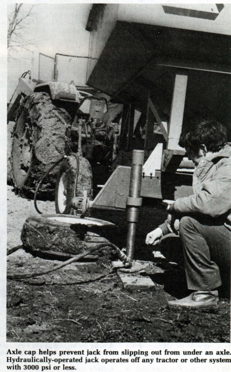 Available in 8 or 20-ton models, it operates off the tractor's hydraulic system. Both models lift up to 11 in. in one stroke. A special "lifting finger" attachment adjusts to within 4 in. of the ground, allowing the jack to get low down for raising machines which are broken down and laying on the ground.