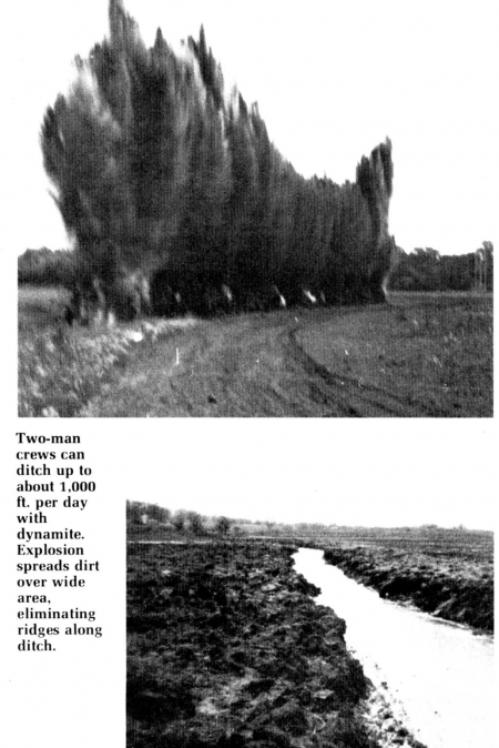 Blasting works better in heavy soils than in sandy ones, and any job has to be done when the soil is wet. Average ditches blasted out by dynamite are 3 1/2 to 4 ft. deep and 6 to 8 ft. wide. Average displacement is about 120 cu. yds. of earth for every 100 ft. of ditch. Wilson says he averages 600 to 1,000 ft. of ditch daily, depending on soil moisture and whether pasture, swamp or timberland is being ditched with dynamite.