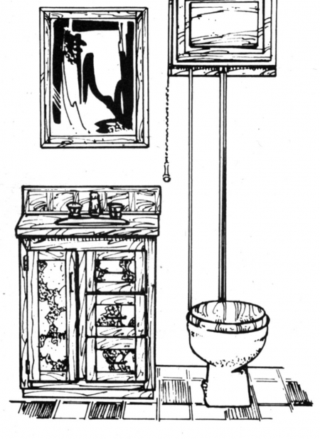 Complimenting the water closet is an elongated solid oak seat with polished brass hinge. Solid oak framing sets off an ornate, matching wall mirror. Rounding out the "old fashioned charm" of this unique bathroom suite is a hand-rubbed oak vanity. Raised panel drawers and front doors give it a distinctive look. Also available is a just introduced pedestal type sink. All the pieces are available in a matched set, or you can buy them separately.