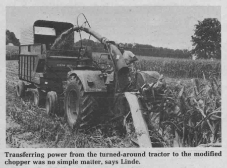 The tractor is driven in reverse, and the chopper unit is directly behind the driver's seat, Gilbert has to pilot the unit from a seat on the fender. The clutch would be inaccessible there, so special linkage was required to solve the problem. As for the brake pedals, Gilbert says he just twists his foot a little and reaches them that way.